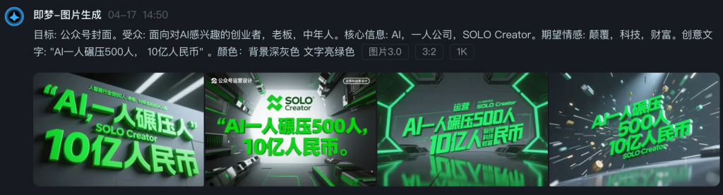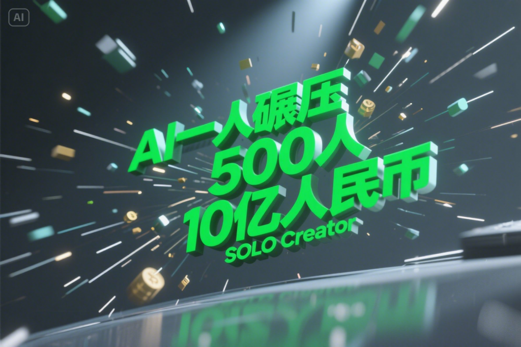 目标: 公众号封面。受众: 面向对AI感兴趣的创业者,老板,中年人。核心信息: AI,一人公司,SOLO Creator。期望情感: 颠覆,科技,财富。创意文字: “AI一人碾压500人, 10亿人民币” 。颜色:背景深灰色 文字亮绿色