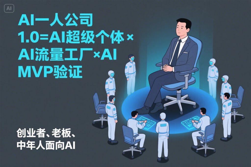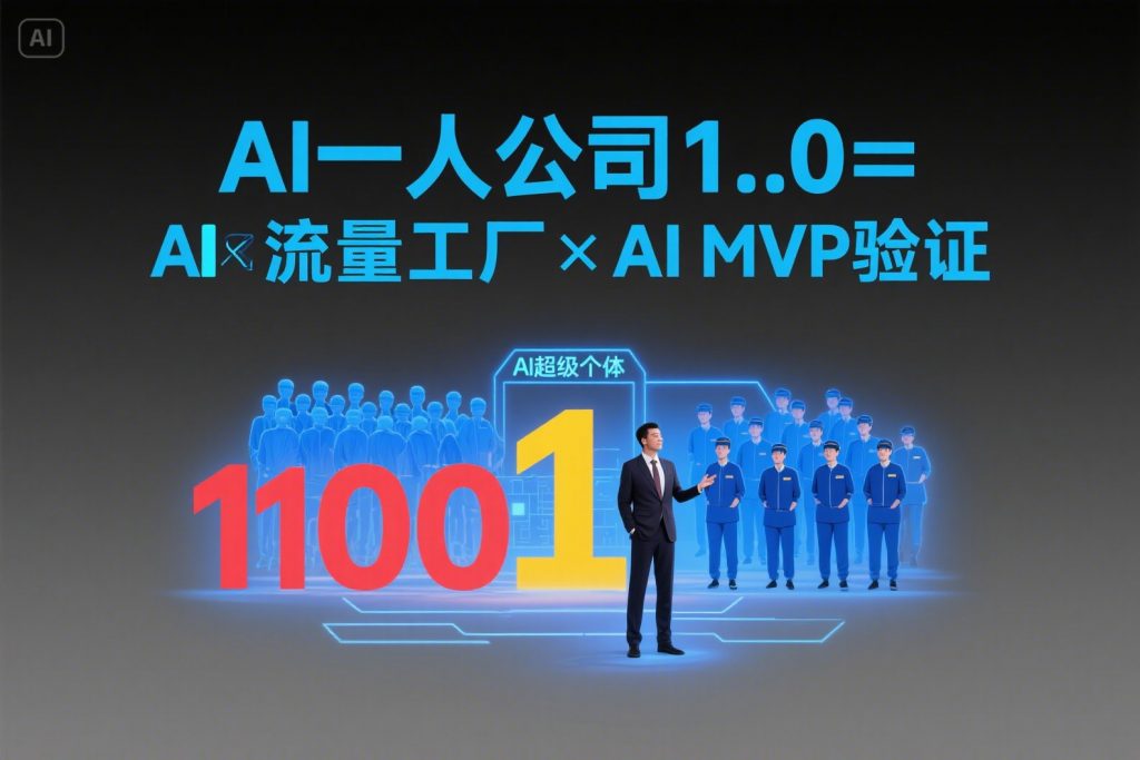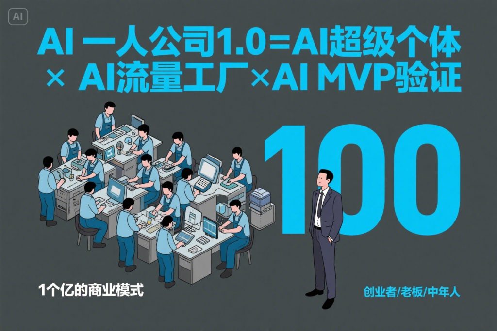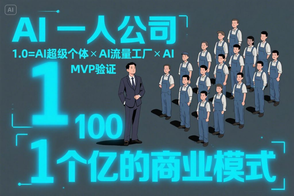 目标: 桌面壁纸。受众: 面向对AI感兴趣的创业者,老板,中年人。核心信息: 1个创始人+100个AI员工:1个亿的商业模式期望情感: 商业模式,AI科技,财富。创意文字: “AI一人公司1.0=AI超级个体×AI流量工厂×AI MVP验证”。颜色:背景深灰色 文字亮蓝色